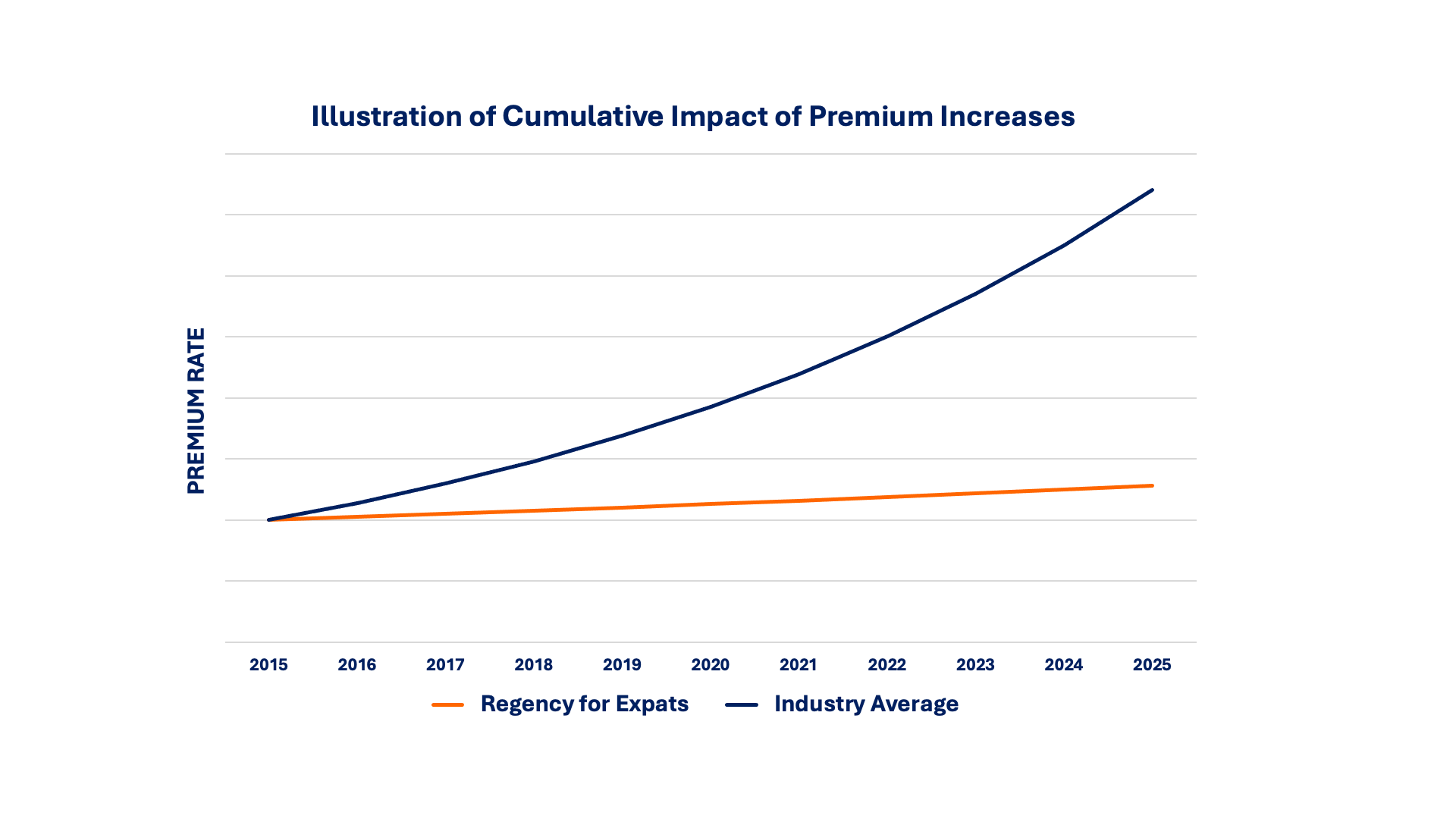 The following graph shows how even modest annual increases compound significantly over ten years, contrasting broader market trends with Regency for Expats’ controlled premium movement.